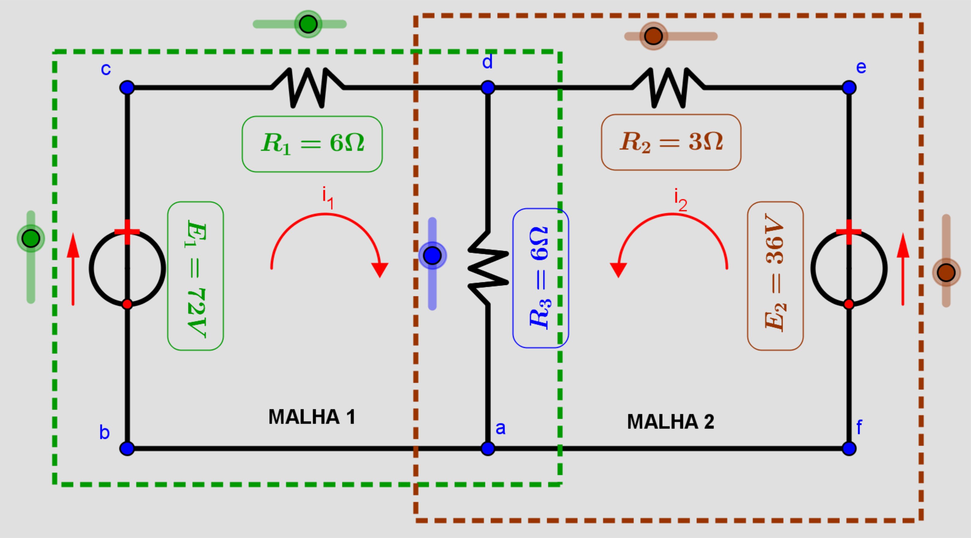 Os sentidos das correntes são atribuídos aleatoriamente, e as malhas são definidas de cores verde e vermelha conforme a figura.